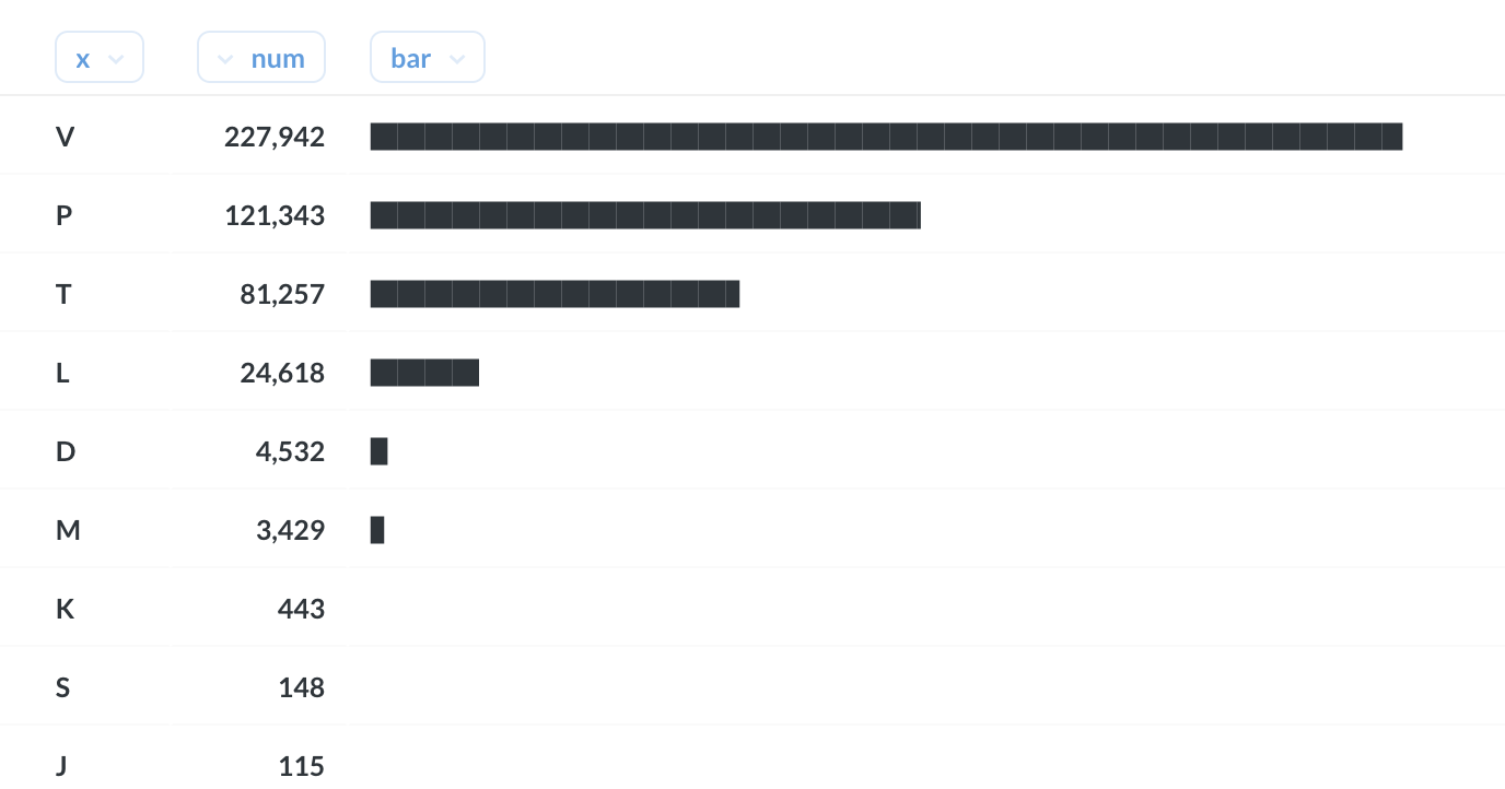select substring(msn,1,1) as x,count(1) as num,bar(num,0,3000000,500) AS bar